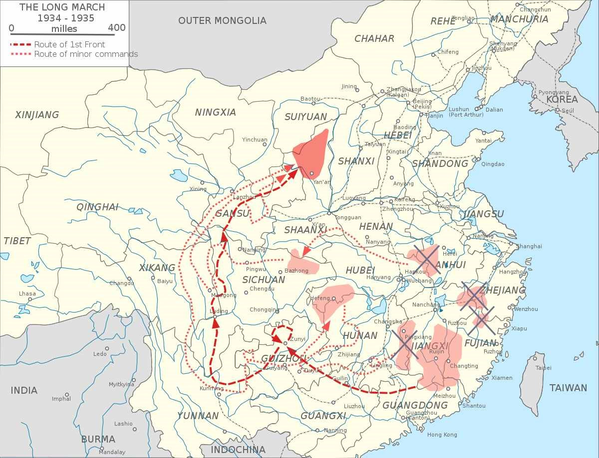 Tired from four years of attacks by the KMT and realizing their own vulnerability to other outside threats, the CCP decided to relocate to a more secure area in 1934. It was reported that roughly 80,000 loyal CCP members left Jiangxi to look for a new base. After three months of seeking a new home, Mao Zedong took control over the Red Army, the forces of the CCP. As Japan expanded into Chinese territories on the eastern side of the country and as the KMT tried to wipe out the CCP farther inland and toward the middle of the country, the men had to march far to the west and then north to escape persecution from both sides. By the time they finally reached the safer areas of China, they had crossed more than 6,000 miles, which included traversing over mountains. This became known as the Long March.