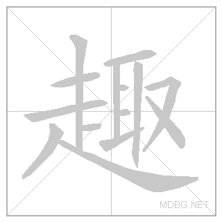 | 趣 | qù | tchoo | 4 | 走 (walk) + 取 (take) → interest | 趣 link | ||||||