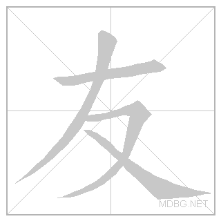 | 又 (hand) + 一 (horizontal) → friend | 又 (semantic: hand) | — | pictographic; no phonetic | ||||||||