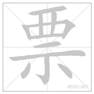 | 票 | piào | pee:aow | 4 | 覀 (west) + 示 (spirit) → ticket | 票 link | ||||||