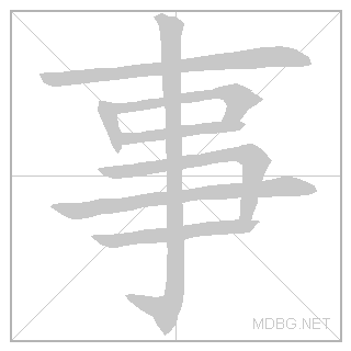 | 事 | shì | sheuh | 4 | 一 (horizontal) + 口 (mouth) + 亅 (hook) → matter | 事 link | ||||||
