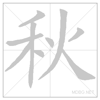 | 秋 | qīu | tchee:oh | 1 | 禾 (grain) + 火 (fire) → autumn | 秋 link | ||||||