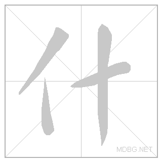 | left‑right; pronoun | 什 (亻 person radical + 十 ten) + 么 (丿 slash + 厶 private) | ||||||||||
