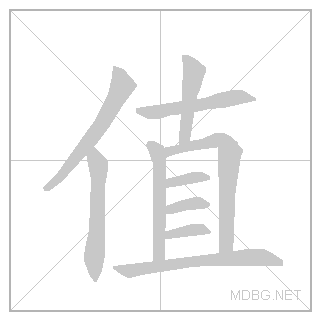 | [HSK 3] - The Chinese character 值 translates to value or worth in English. It can also mean to be worth or to be equal to depending on the context. | |||||||||||