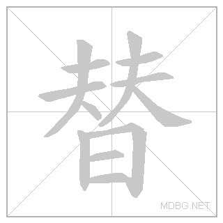 | 替 | tì | tee | 4 | 夫 (man) + 夫 (man) + 日 (sun) → replace | 替 link | ||||||